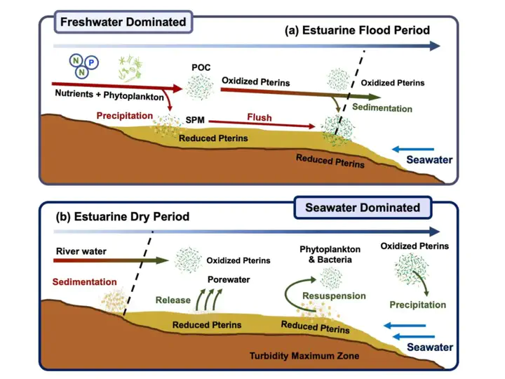 Pterins serve as precursors, pigments, and enzymatic cofactors in microbes, contributing to global nutrient cycles and unconventional carbon and nitrogen utilization. This study investigated the biogeochemical characteristics of microbial pterins in the Jiulong River Estuary and Xiamen Bay, focusing on their spatiotemporal distribution in estuarine wetlands during dry and flood seasons. However, the ecological significance of pterins as biomarkers for carbon accumulation and degradability in estuarine sediments remains underexplored, limiting their application in monitoring coastal carbon sinks and algal bloom dynamics. By analyzing correlations between environmental factors and biological indices, we provide novel insights into estuarine ecological processes. Our results indicate that during the flood season, phytoplankton, including freshwater algae and cyanobacteria, are the primary sources of microbial pterins, driven by high productivity from upstream inputs. In the dry season and under reducing sediment conditions, heterotrophic contributions to microbial pterins become more prominent. Dihydro-neopterin and neopterin dominate in reducing sediments, while biopterin and its metabolite isoxanthopterin are more prevalent in the water column. The strong correlation between chlorophyll a and pterins suggests that microbial pterins co-vary with phytoplankton biomass and may serve as indicators of marine algal blooms. Increased pterin levels signal bloom initiation, while their rapid consumption marks bloom progression. Additionally, sediment C/N ratio and isoxanthopterin levels hint at the potential use of pterins as biomarkers for revealing coastal carbon dynamics. These findings highlight the need for further research on the role of pterins in carbon cycling and their application in monitoring marine ecosystems.